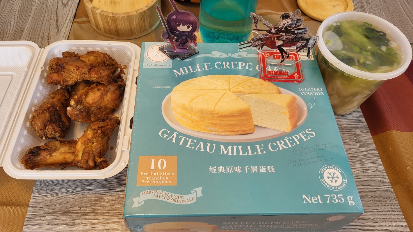– Happy Birthday to me. My Chinese food and Mille Crepe Cake treat. Scathach and Bismarck standing by.