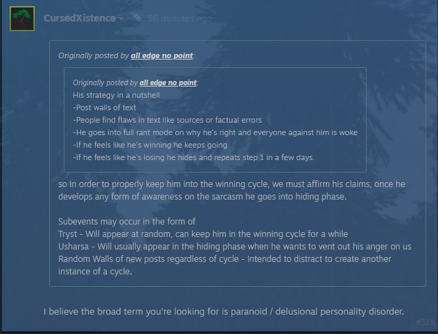 And, of course, as per usual…. CursedXistence with typical insulting character. Defamation, as they say. Do I need to say more? Simply because I offended people they see what isn’t there, and then everything is my fault, or I’m allegedly an ‘Schizo’, which is ironic coming from these very same delusional people.