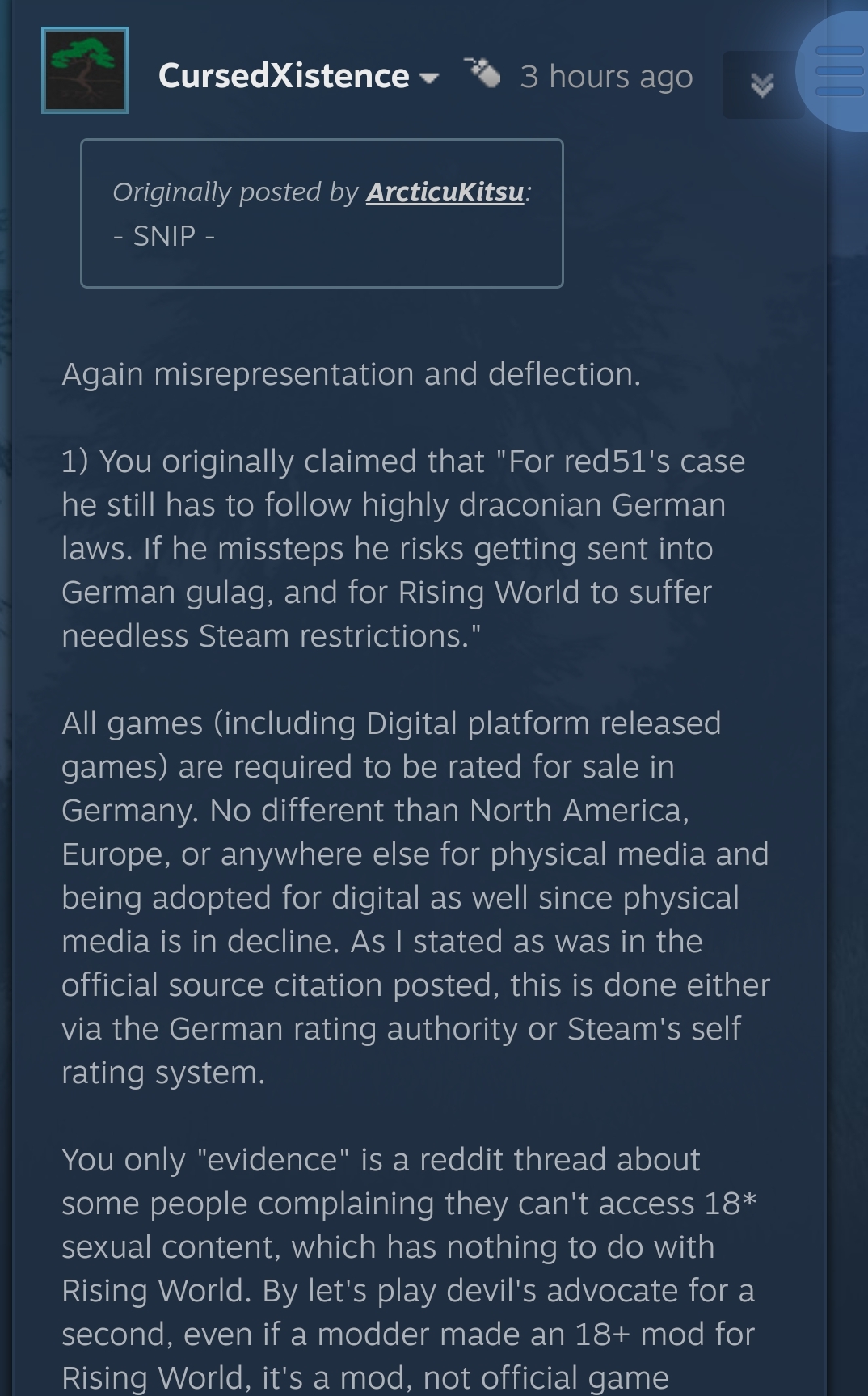 With how bat-shit insane Germany has been going I wouldn’t be surprised if Rising World was penalized for something petty, hence my constant concerns. The same concerns which CursedXistence continuously disregards over his own personal fragility. There is always something being banned, restricted, or removed over nonsensical reasonings. Salami-slicing censorship tactics, just because they can, and as Visa/Mastercard has done because Asians are undoing Left-Wing political nonsense with simple Anime and Asian games. Lies are being exposed far too easily in Asian countries of the oriental variety (excluding India). - His noting of ratings and etc is irreverent, even if I noted they’re different topics, yet part of the same fish. One’s the fins, the other is the tail, just not in the same area. It’s all fluff and puffery just to make me look bad, and it seemed to have worked at the time.