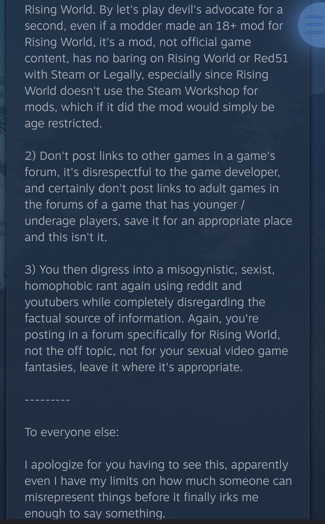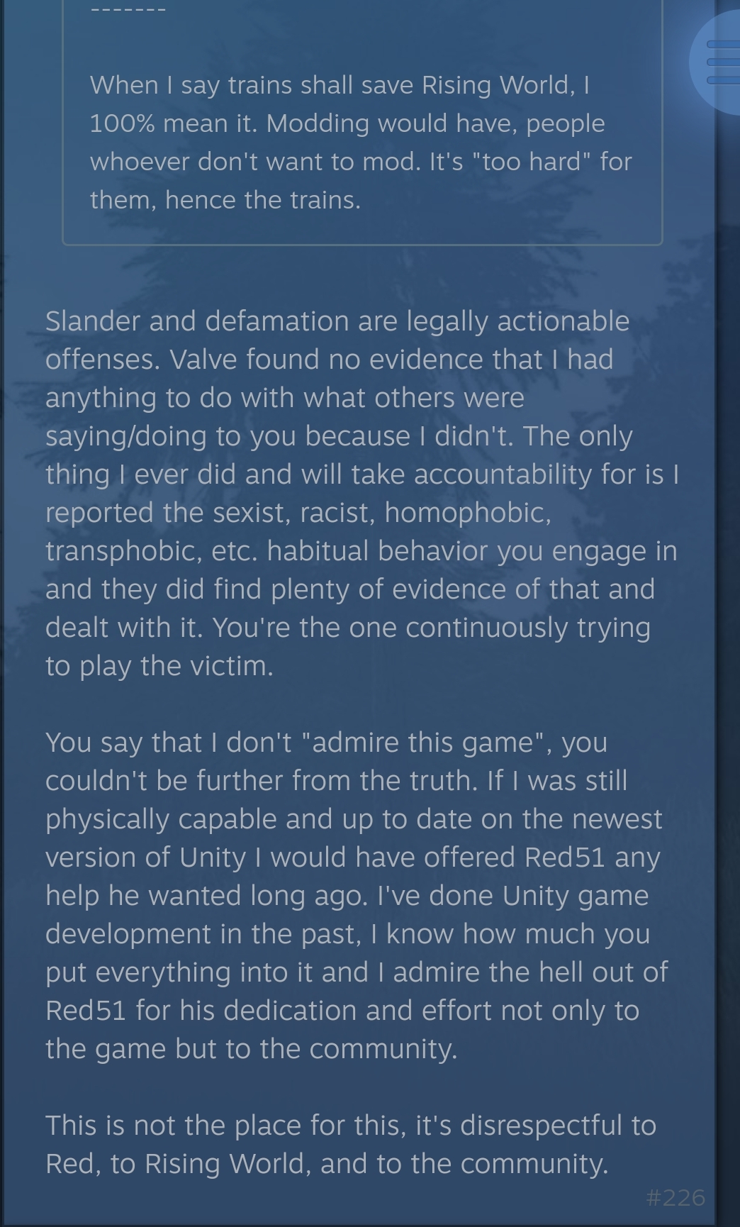 It honestly amazes me the various people I encounter who desire me canceled always have police-worthy skeletons in their closet. Discord bans their duplicate accounts, Steam Moderation/Support protects them, yet they’re there, preying and sabotaging people. Sexually exploiting others, and CursedXistence happily associates himself with these folks. Guilty by association. It’s honestly no wonder they desire me banned off of Steam forums and the main forums. What a scandal. I mean, it would be if the Rising World community had any form of dignity and remorse of any kind. I have yet to receive any form of genuine apology from anybody, including Red51. But no, Red51 desired to offer to have my game refunded. No remorse.