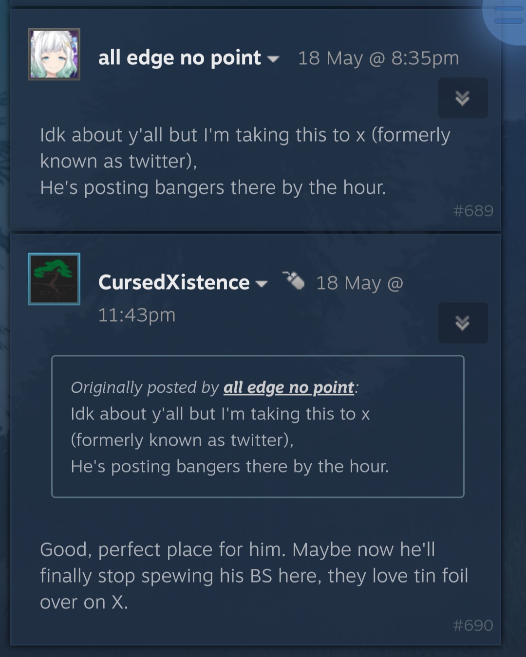 Yeah, I briefly “migrated” to Twitter/X to give them the false sense of victory, but I also desired to come back to agitate them further. It was fun exposing their hypocritical, bullying behaviour. Milking their stupidity. I need to give them a hard time they’ve shown me, and it was fun seeing them tantrum each time I come back. All Edge No Point now has to worry about her sexual exploitation problems, so that’s a good thing. She can fuck off, and so can CursedXistence. He can deal with God in the few weeks, and suffer for all the fallacies they’ve actively participated in.