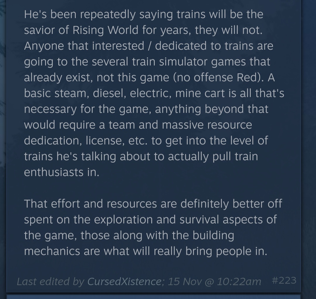 This one is simple, and doesn’t really say much. He simply believes trains won’t save Rising World, nor will they be a worthwhile implementation, as shown below. I understand the issues with islands being small, but they could be used in a similar fashion to Osaka’s train loop. Same with Hakodate’s tram loop, etc. Or underwater subway networks, or over-sea train bridges. Never underestimate the train nerds in the train community. People have placed trains in farming simulator games via mods, in Minecraft; Coming official feature in Mars survival games, and also Dinkum, Infinite Rails, among others. Give people the proper mechanics and they’ll have fun. People genuinely admire trains, and that’s a fact.